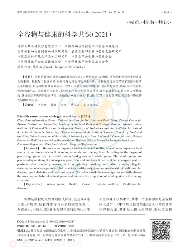 谷物是膳食的重要基础组成部分,也是B 族维生素、矿物质、膳食纤维等营养素的重要食物来源。根据加工程度不同,谷物可分为精制谷物和全谷物。全谷物的特点是保留了完整谷粒所具备...