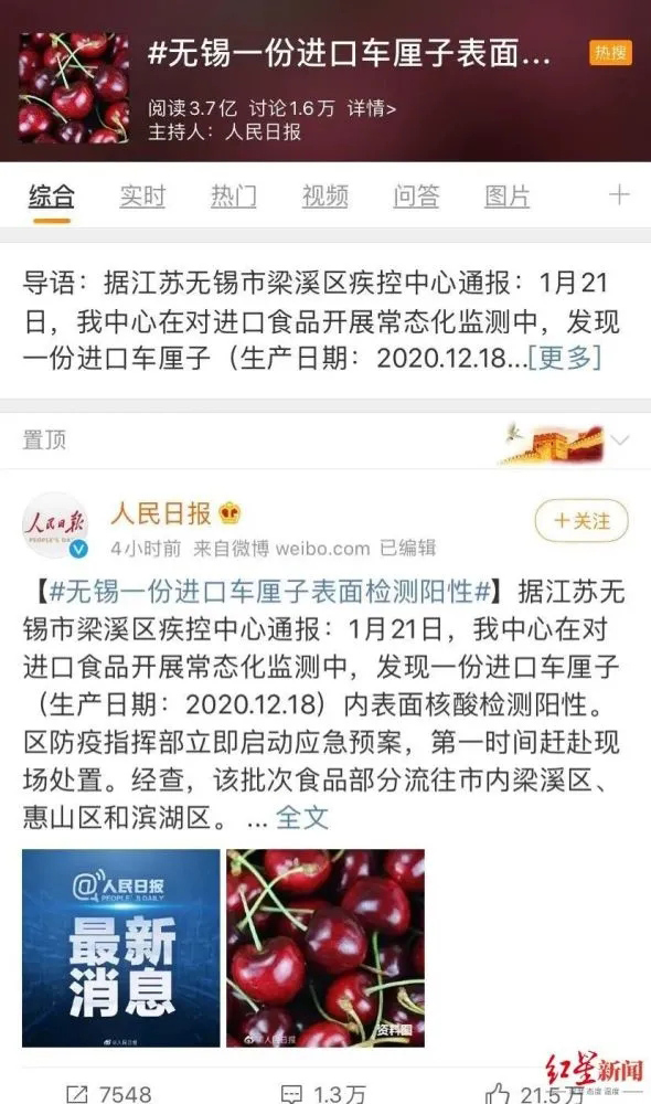 前几日,进口车厘子降价的消息才让不少人尝了鲜,而此次车厘子表面被爆出核酸检测阳性,也让广大网友直呼“有点怕”,该新闻一度登上微博热搜,截至发稿前,阅读量已超3亿。