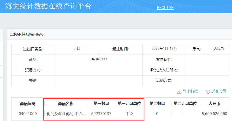 健康时报记者在中国海关官网查询发现,2020年1月~2020年12月,我国共进口乳清粉62万吨(622370137千克)。
