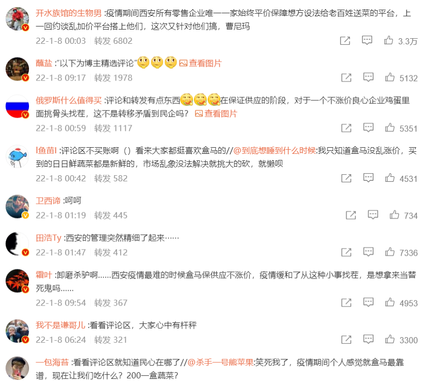 然而,评论区却翻车了。网友几乎一边倒的骂监管部门,包括一些很有影响力的大 V。很显然,在西安封城期间盒马鲜生不涨价、保供应是赢得了民心的。但是,你真觉得盒马没问题?