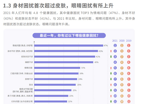 第二,在各类健康困扰中,人们对身材的关注首次超过皮肤,排名第二,这其中主要是肥胖相关的身材困扰。