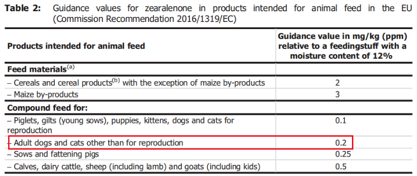 食品有真菌毒素限量,饲料也有。比如中国通用的《饲料卫生标准》中的ZEN限量是500ppb(即微克每公斤),《宠物饲料卫生规定》中成犬饲料的ZEN限量为250ppb。网上有些人对“产品符合(中国)国家标准”嗤之以鼻,更推崇欧美标准。但是最保守、最严格、动物福利最完善的欧盟的标准,狗粮ZEN的限量也是200ppb,和中国差不多。