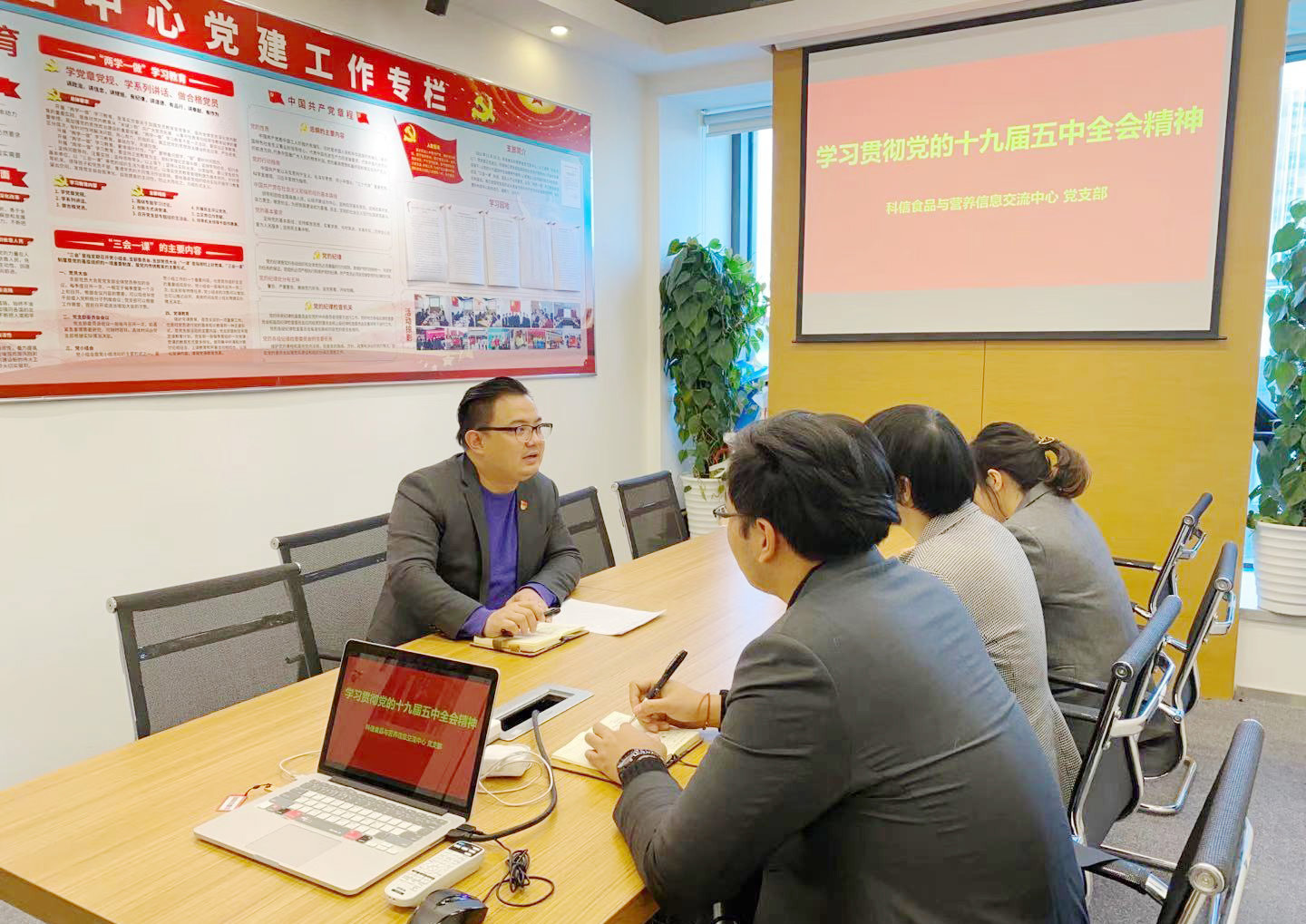 食品与营养信息交流中心组织全体党员集体学习,第一时间传达学习党的十九届五中全会精神、集中学习《中国共产党第十九届委员会第五次全体会议公报》和人民日报社论。中心党支部书记吴桐主持学习。