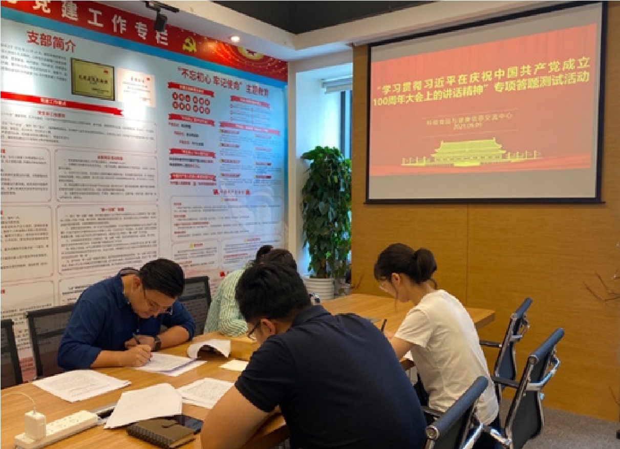 中心党支部书记吴桐部署了此次学习测试活动的相关工作,然后吴书记带领大家再次回顾了习近平总书记在中国共产党成立 100 周年庆祝大会上的重要讲话内容。大家纷纷表示习近平总书记以深邃的历史眼光、深厚的为民情怀、强烈的担当精神,向全党发出号召,要求继续弘扬光荣传统、赓续红色血脉,永远把伟大建党精神继承下去、发扬光大,要以史为鉴、开创未来,在九个方面“必须”做到,为我们乘势而上、开拓奋进,为实现第二个百年奋斗目标、实现中华民族伟大复兴而努力奋斗指明了方向、提供了根本遵循。我们要学习领会习近平总书记重要讲话精神,坚决响应习近平总书记对全体共产党员提出的号召要求,牢记初心使命,坚定理想信念,践行党的宗旨,永远保持同人民群众的血肉联系,努力做好食品安全信息交流工作,全面提升服务质量。
