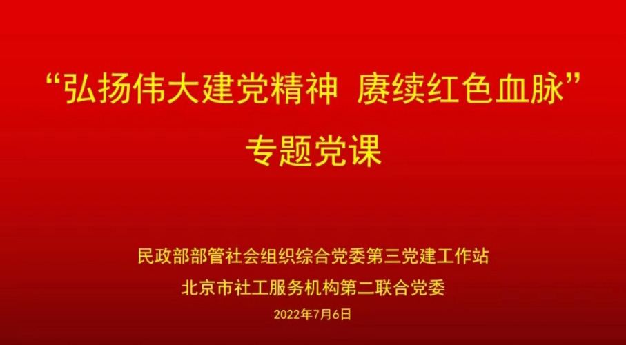 7月6日下午,民政部部管社会组织综合党委第三党建工作站和北京市社工服务机构第二联合党委联合组织开展“弘扬伟大建党精神 赓续红色基因血脉”专题党课学习,这是第三党建工作站组织开展的以“庆‘七一’ 喜迎二十大”为主题的系列活动之一。