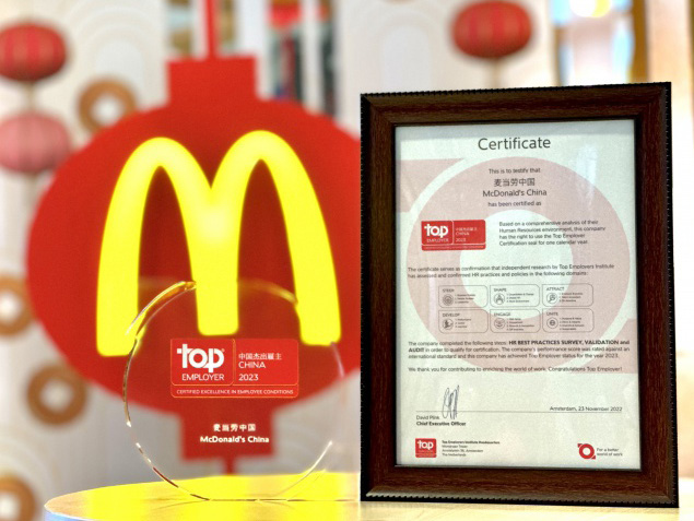 2023年1月17日,上海,麦当劳中国获得由杰出雇主调研机构(Top Employers Institute)颁发的中国杰出雇主 2023认证。麦当劳中国以绿色增