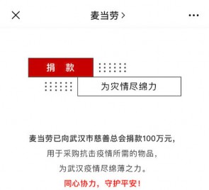 2450 家餐厅外送服务不断,为 1500 多家医院提供 餐饮外送服务。在非常时期,麦当劳心系武汉,情 牵白衣战士,在武汉专门设立一家爱心防疫餐厅, 公司一个倡议书,就超过 300 个员工志愿者报名,每天为武汉 161 部队医院和武汉大学中南医院等医 务工作者提供热乎乎的免费餐食,除此,全国各地 餐厅根据各自运力,为全国不同医院、疾控中心等, 每天提供超过 2500 份的爱心免费餐食,至今累计超过 5 万份。同时麦当劳发挥全球采购资源优势,紧急从海外购买 20 万个医用口罩,驰援湖北省、